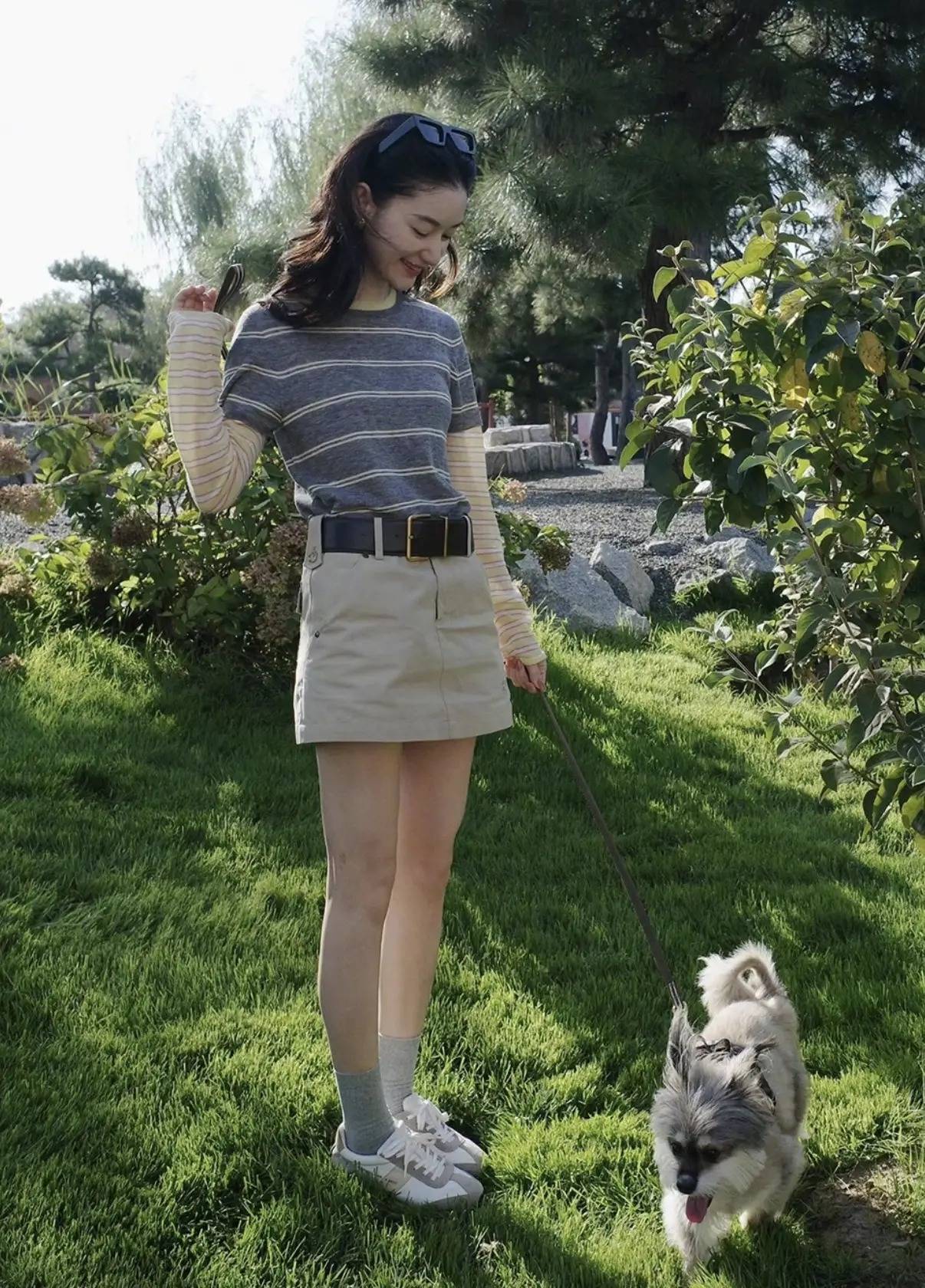 灰黄条纹假两件长袖,叠穿谋略可处理早春温差问题,内长外短的脉络显得腿长。卡其色工装短裙 + 宽版黑皮带,短暂拉高腰线,将身段比例优化成“三七分”。
