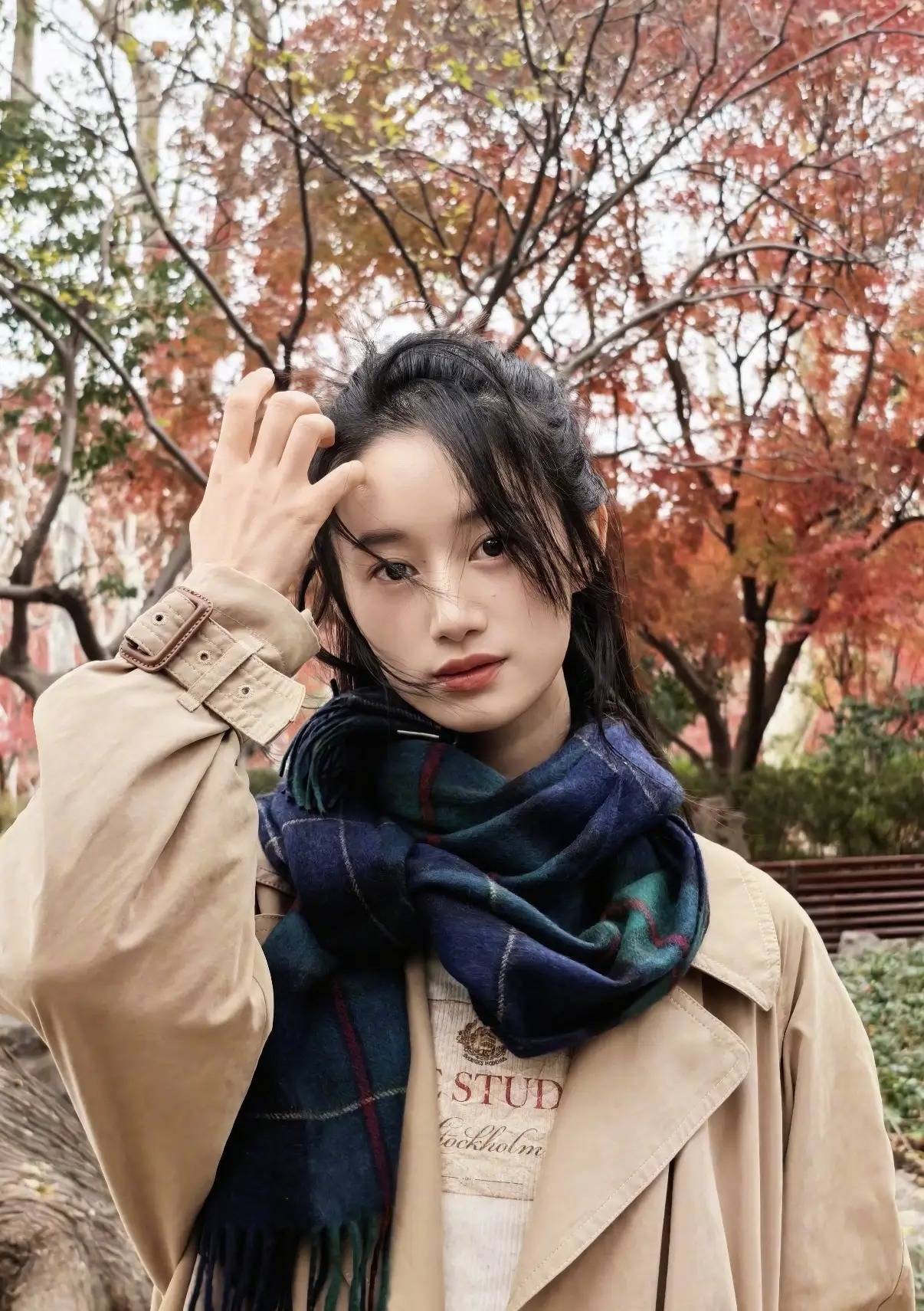 领巾的格纹色和洽风衣的暖调酿成对比,让举座造型更具精采点。