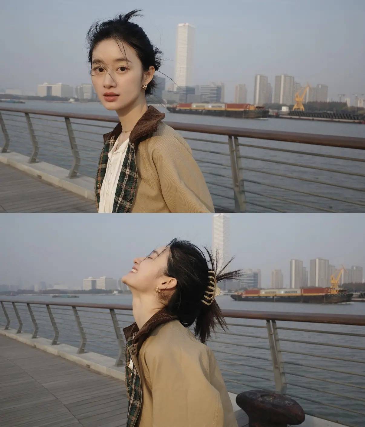 内搭白色衬衫,干净又涌现,与江边的遍及场景极端契合。
