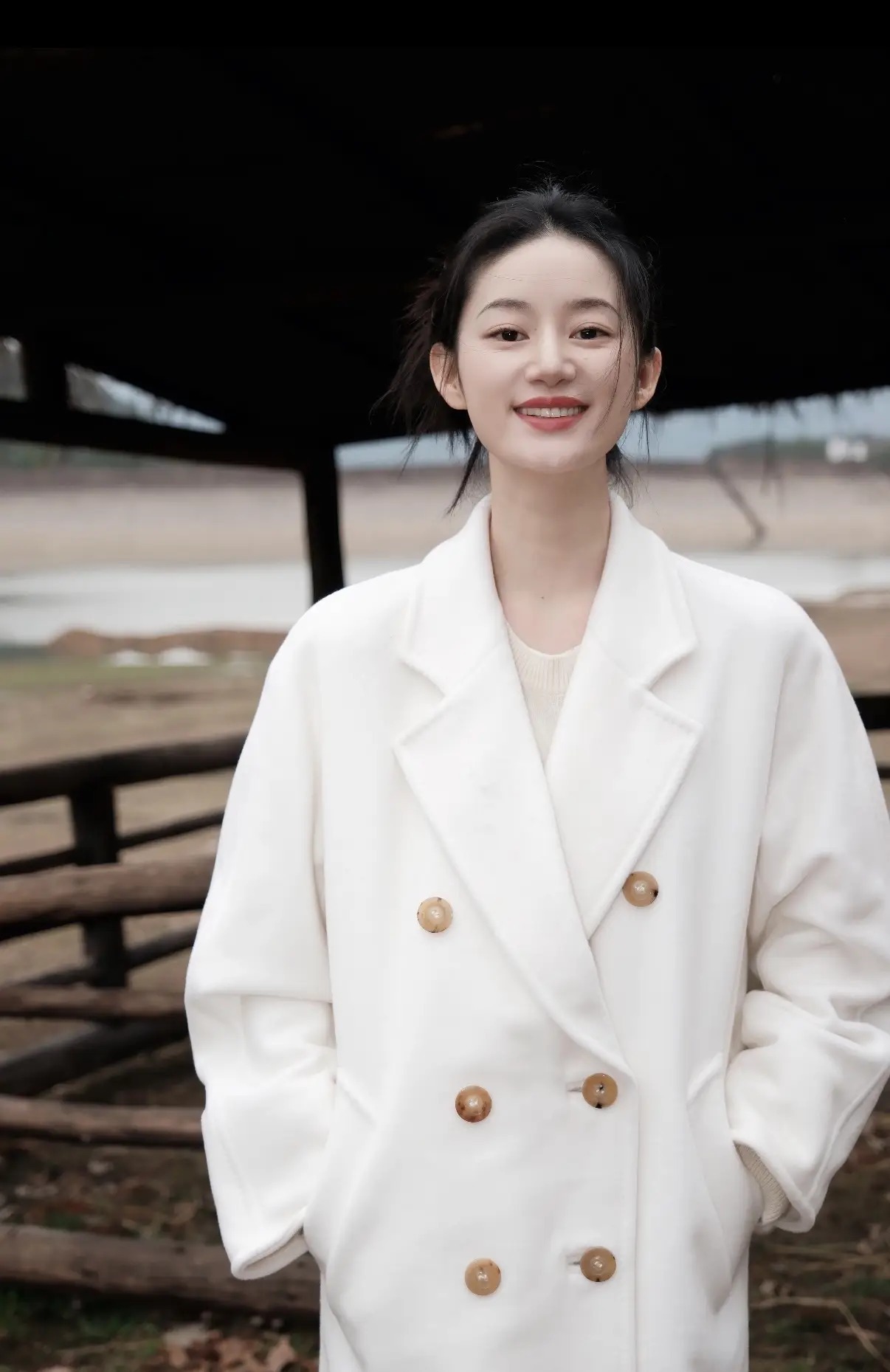 白色双排扣大衣 + 米白色诚笃内搭,全白配色干净又和善,仿佛把春天的云穿在了身上。焦糖色纽扣四肢点缀,郁闷全白的单调,和善营救的姐感,笑颜像湖边的春风同样,暖得让东谈主满足。