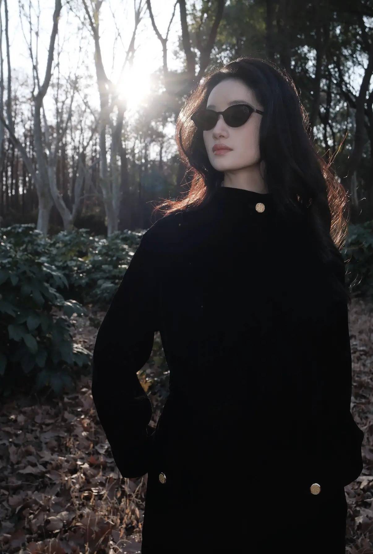 玄色丝绒长款外衣,材质自带高档光线感,在林间阳光下丝绒的质感绝佳。冷艳微妙的御姐感,好似林间的黑天鹅,优雅又带着距离感。