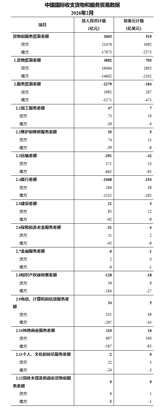 3月27日,国度外汇惩处局公布2026年2月我国国外收支货品和功绩贸易数据。2026年2月,我国国外收支货品和功绩贸易收支口范围39349亿元。其中,货品和功绩贸易出口21476亿元,入口17873亿元,顺差3603亿元。功绩贸易主要名目为:旅行功绩收支口范围1596亿元,其他生意功绩收支口范围1285亿元,bbin运输功绩收支口范围1033亿元,电信、野心计和信息功绩收支口范围628亿元。