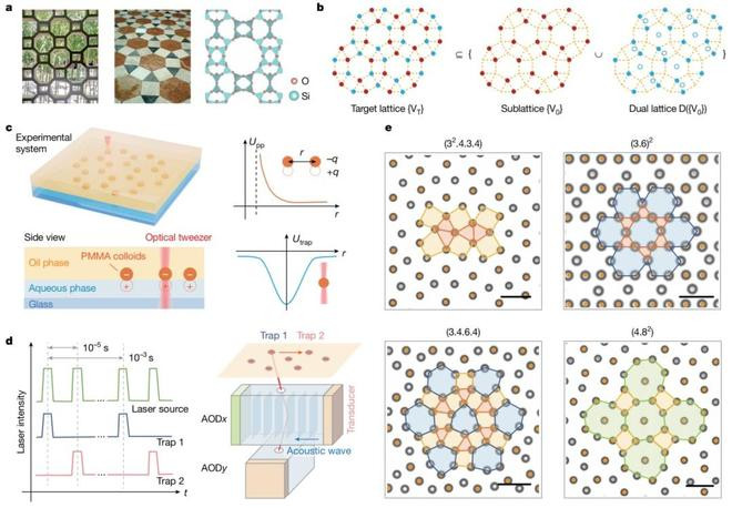 图1:(a)建筑守密与材料中的复杂对称性晶格结构;(b)复杂晶格的对偶子晶格剖判泄露图;(c-d)基于声-光耦合光镊时刻的二维胶体实验系统;(e)基于“对偶对称性招引”自拼装范式构建的复杂胶体晶格。