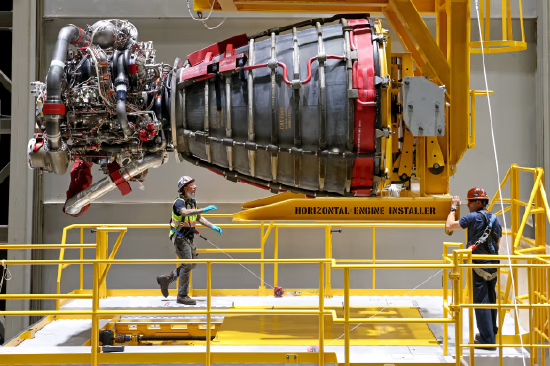 火箭底部装配有四台发动机,与助推器共同将SLS火箭推离大地。这些由L3Harris公司制造的发动机高14英尺,单台推力约50万磅。