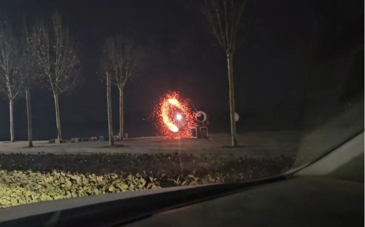 腊月十五凌晨小数半,一个腹地东谈主开车途经,远远拍下了正在直播的乡人。画面里看不清东谈主,唯一两个炭火球在昏暗中高下翻飞,像两团悬浮的火焰。