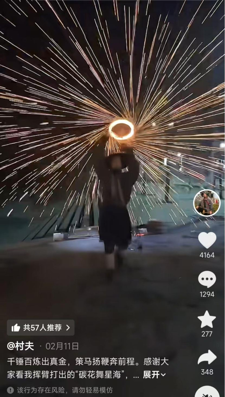 不同于真确的非遗打铁花,要将高温融解的铁水舀起后打散,乡人这一类直播更像是它的简化版——将钢丝棉烧着后,靠东谈主力或电钻甩出火星。近两年,“非遗”成为抖音重心现实的本体赛谈,为了获取保举,主播们也会挂上“非遗”的标签。乡人是这个赛谈上的“顶流”,客岁11月底入场,短短两个月,两个账号积存了14万粉丝,直播在线东谈主数有时能到几千东谈主,别的打铁花直播间时常唯一几十甚而几东谈主。