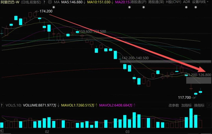 3月20日,港股的阿里巴巴紧接着大跌朝上6%,3月23日又下落朝上3%。